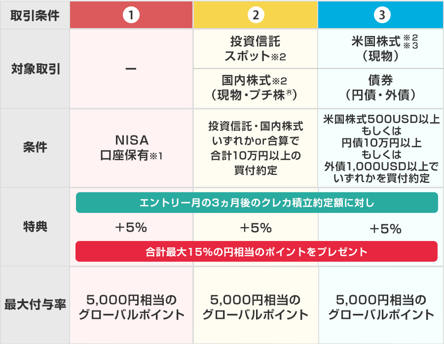 | 特典内容 | エントリー月の3ヵ月後のクレカ積立約定額×最大15%の円相当のグローバルポイントをプレゼント(最大3,000グローバルポイントをプレゼント※15,000円相当) |
