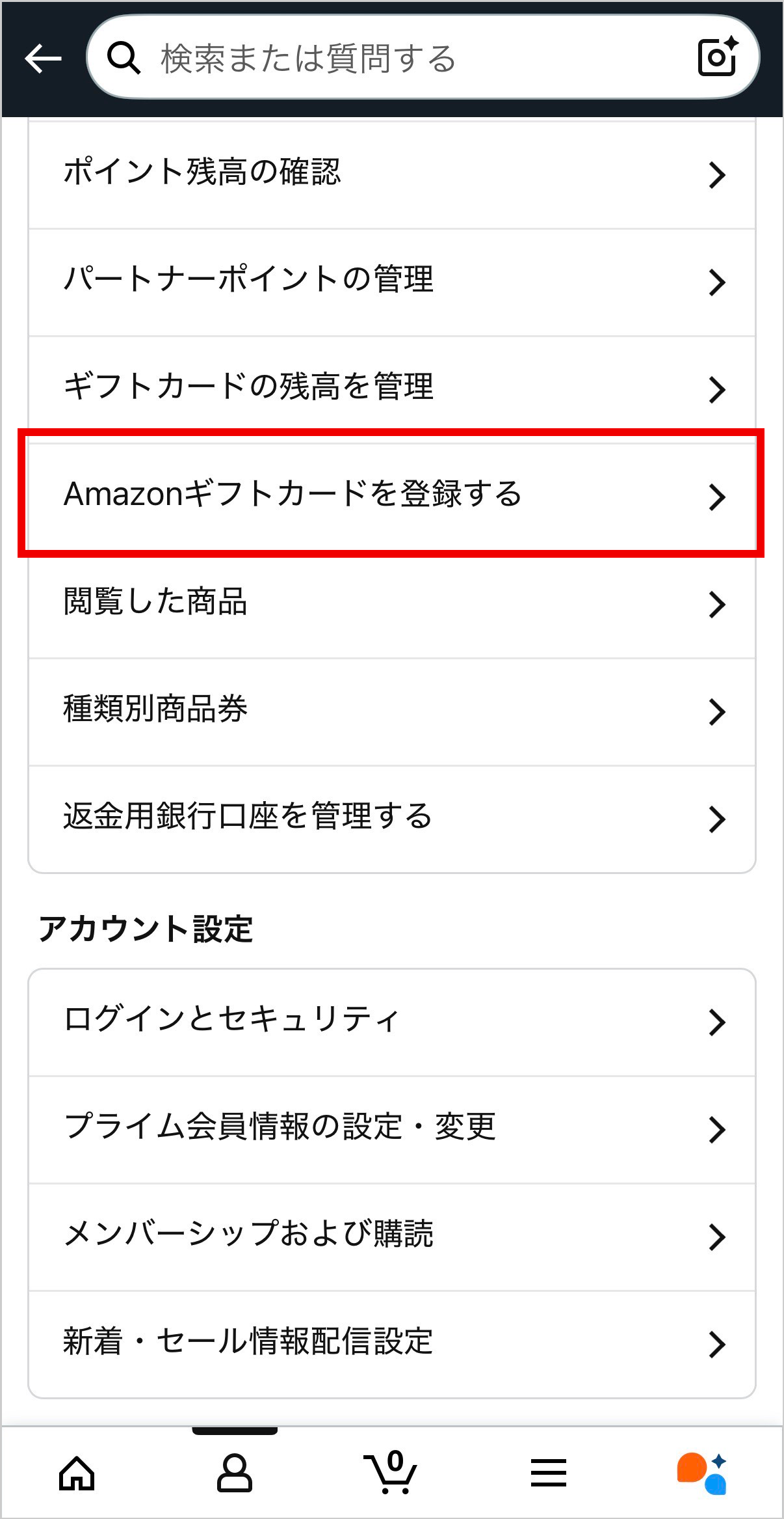 「アカウントサービス」から「Amazonギフトカードを登録する」を選択