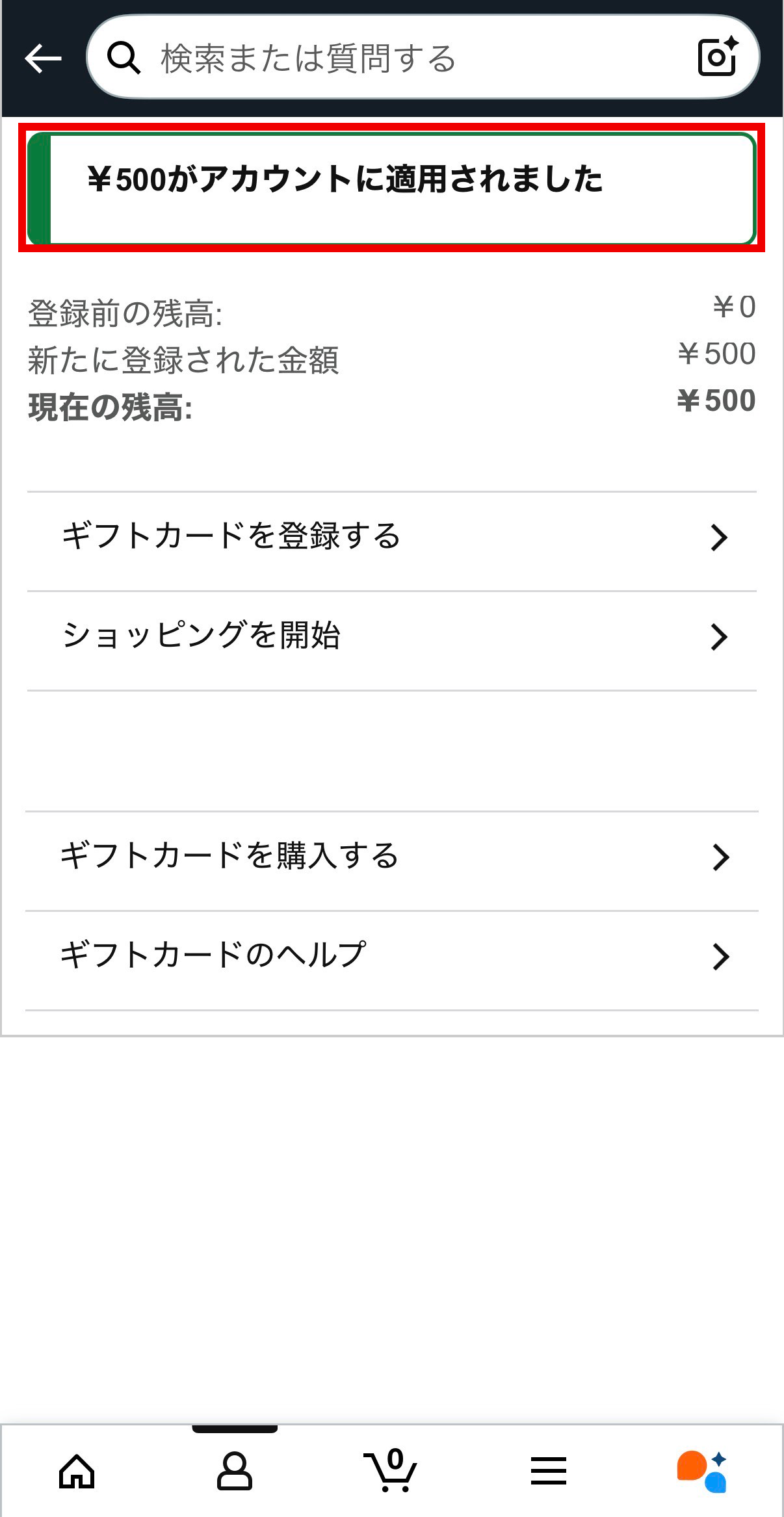 当選画面において表示されたAmazonギフトカードのコードを入力し、