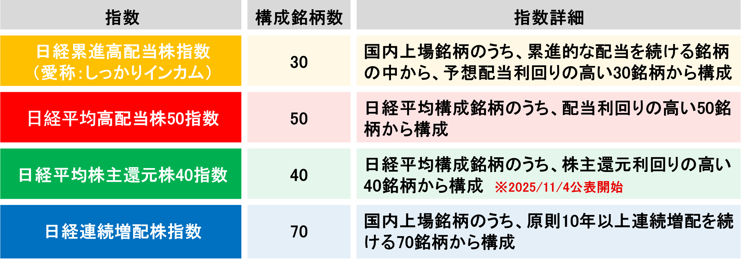 図6の通り、日本経済新聞社が算出している配当関連の指数は現在4指数です。2025年11月には日経平均構成銘柄の中から還元利回りの高い40銘柄から構成される「日経平均株主還元株40指数」の公表が開始されました。