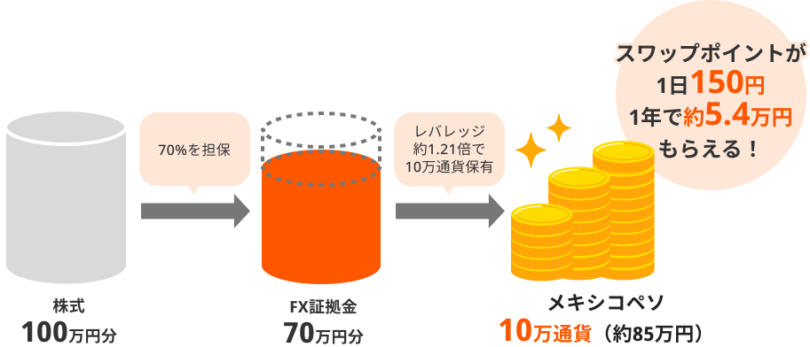 日本のような低金利の通貨を売り、メキシコペソのような高金利の通貨を買って保有すると、スワップポイントを原則毎日(土日祝除く)受取ることができます。ただし、低金利の通貨を買い、高金利の通貨を売るとスワップポイントの支払いが発生します。