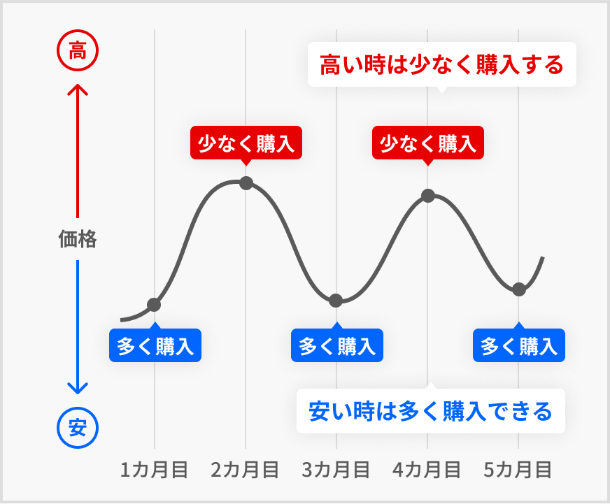 「あらかじめ決まった金額」を「続けて」投資することで、価格が高い時に買いすぎたり、安い時に買い逃すリスクを抑えられます。
