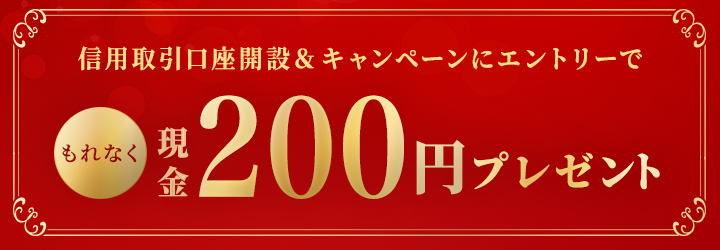 | 特典付与条件 | 初めて信用取引口座を開設した月中に、キャンペーンにエントリーが必要です。 |