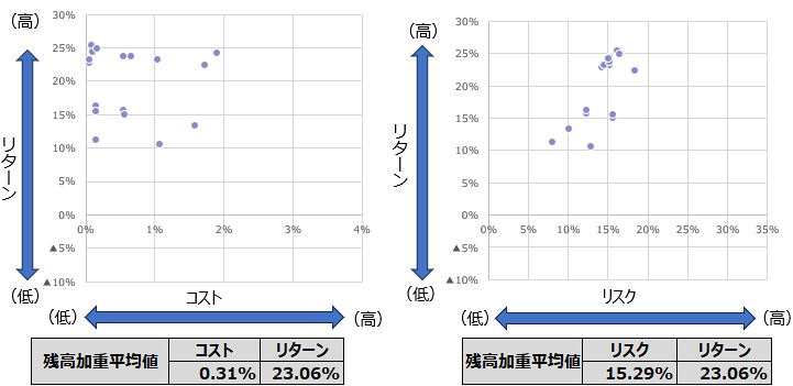 投資信託の預り残高上位20銘柄のコスト・リターン及び、投資信託の預り残高上位20銘柄のリスク・リターン