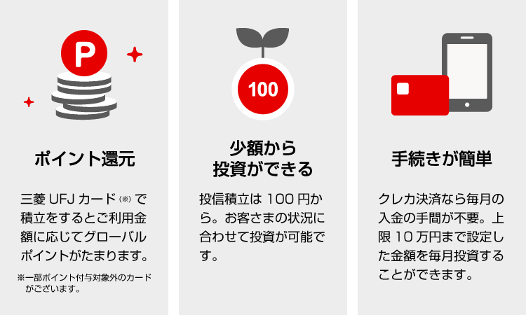 三菱UFJカード積立(投資信託)は、株式会社三菱UFJフィナンシャル・グループ(取締役 代表執行役社長 グループCEO 亀澤 宏規、以下「MUFG」)のグループ各社との協働の一環としてご提供します。