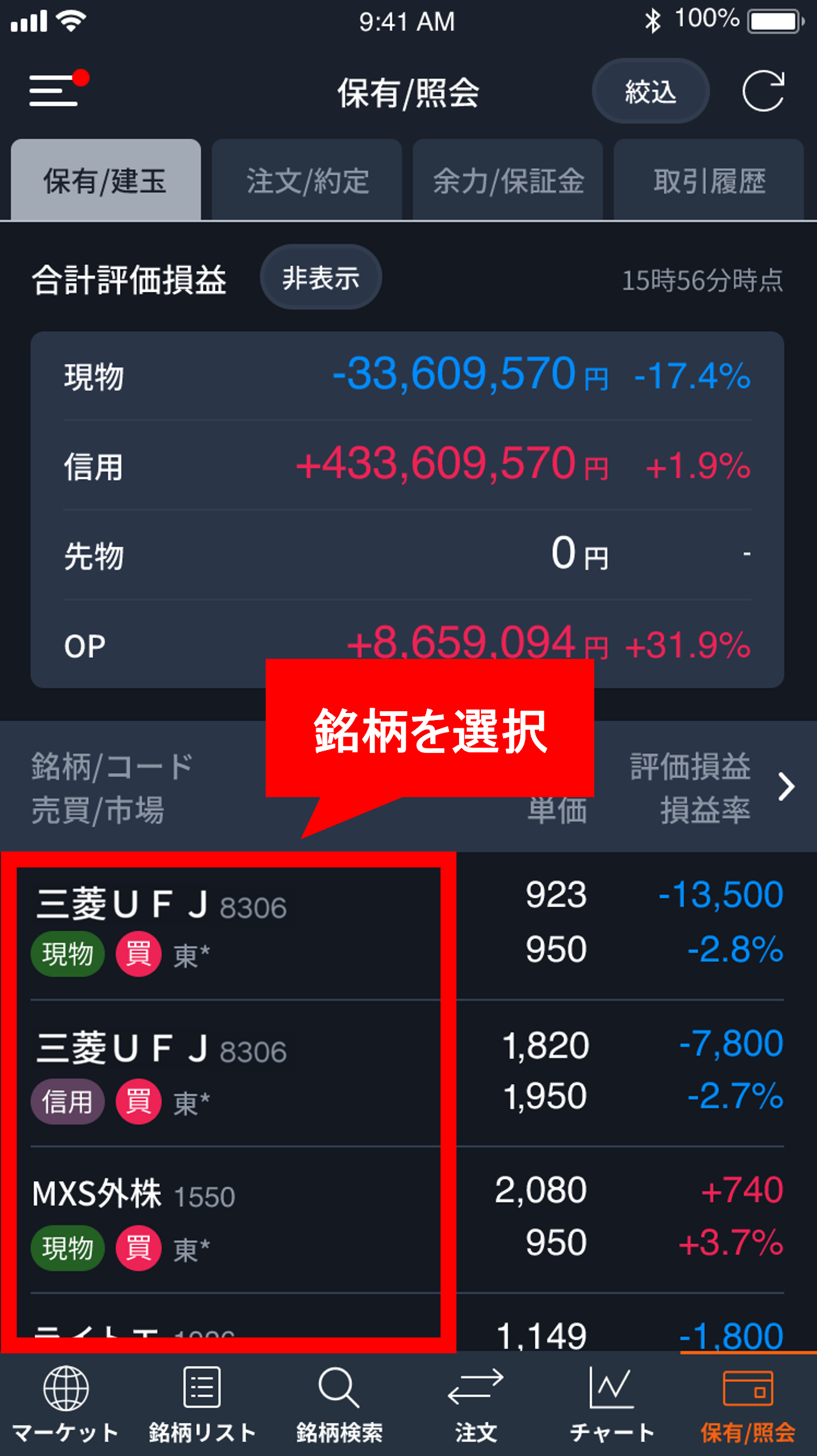 「保有/照会」の保有建玉から銘柄を選択し、「残高照会明細」より対象建玉を選択することで個別返済が可能です。