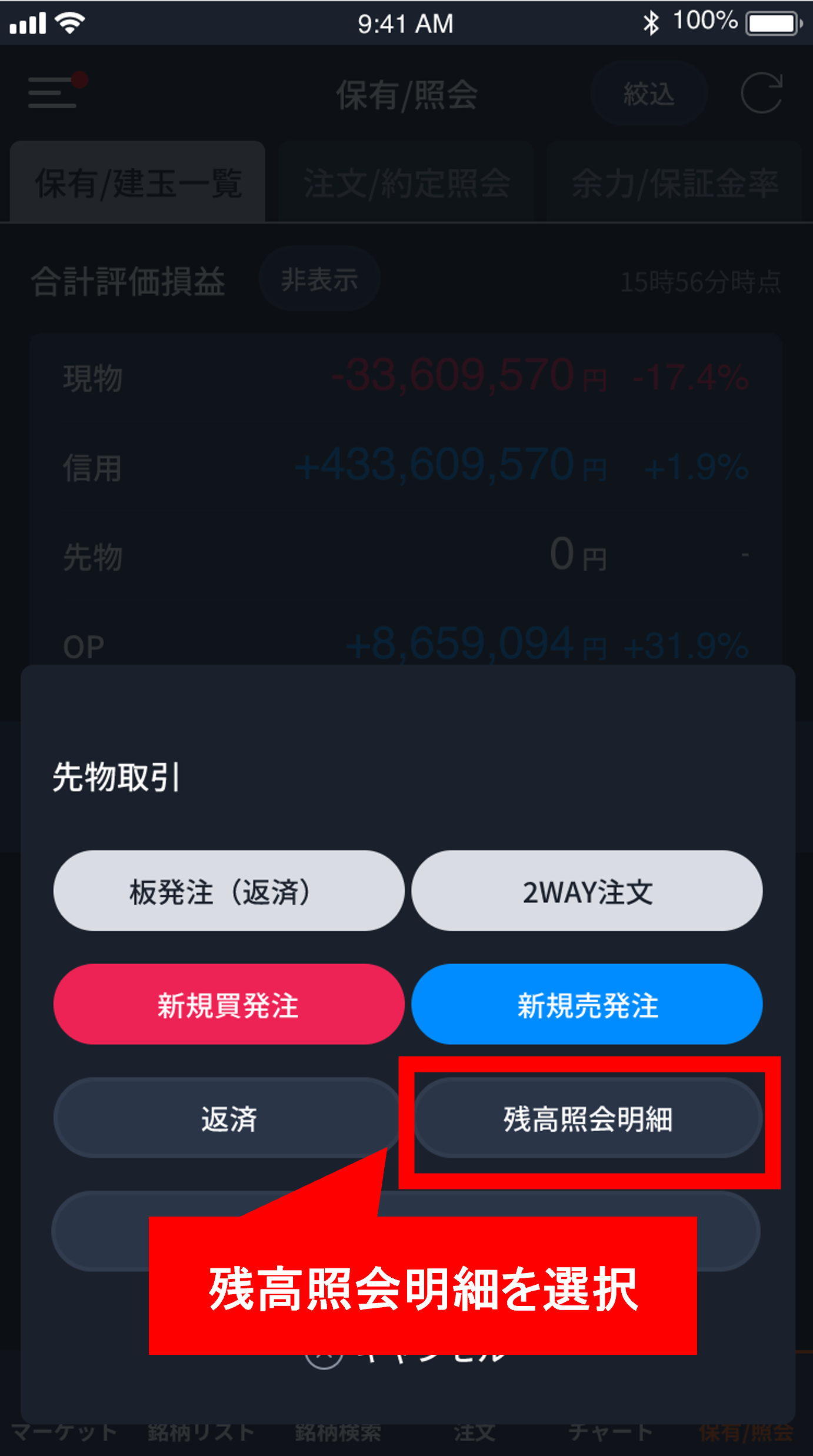②対象の銘柄を選択し、メニューから「残高照会明細」を選択します