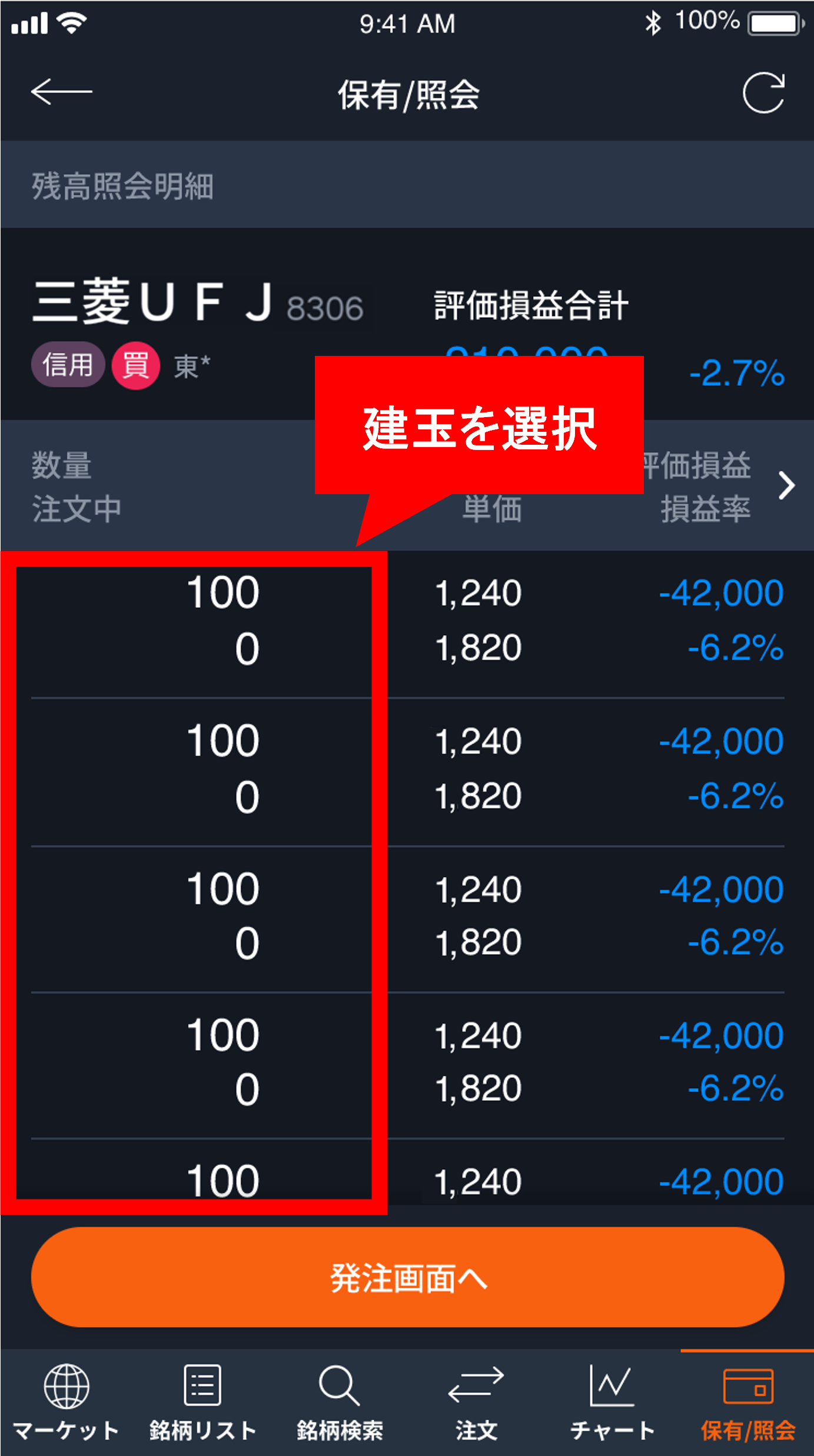 ④「残高照会詳細_建玉残高」の画面より「発注画面へ」を選択します
