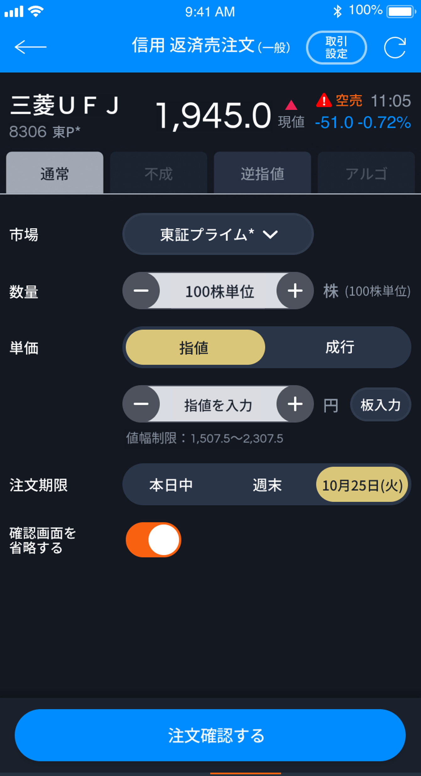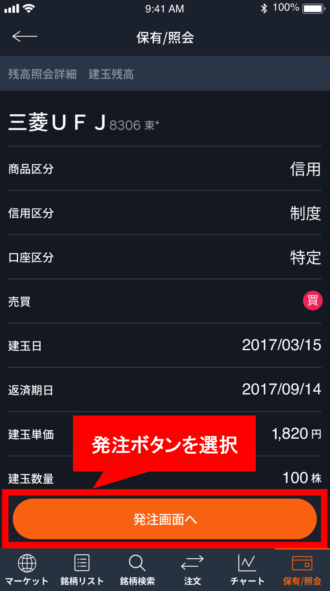 ※本画面で「発注画面へ」を選択した場合、一括返済の注文画面へ遷移します