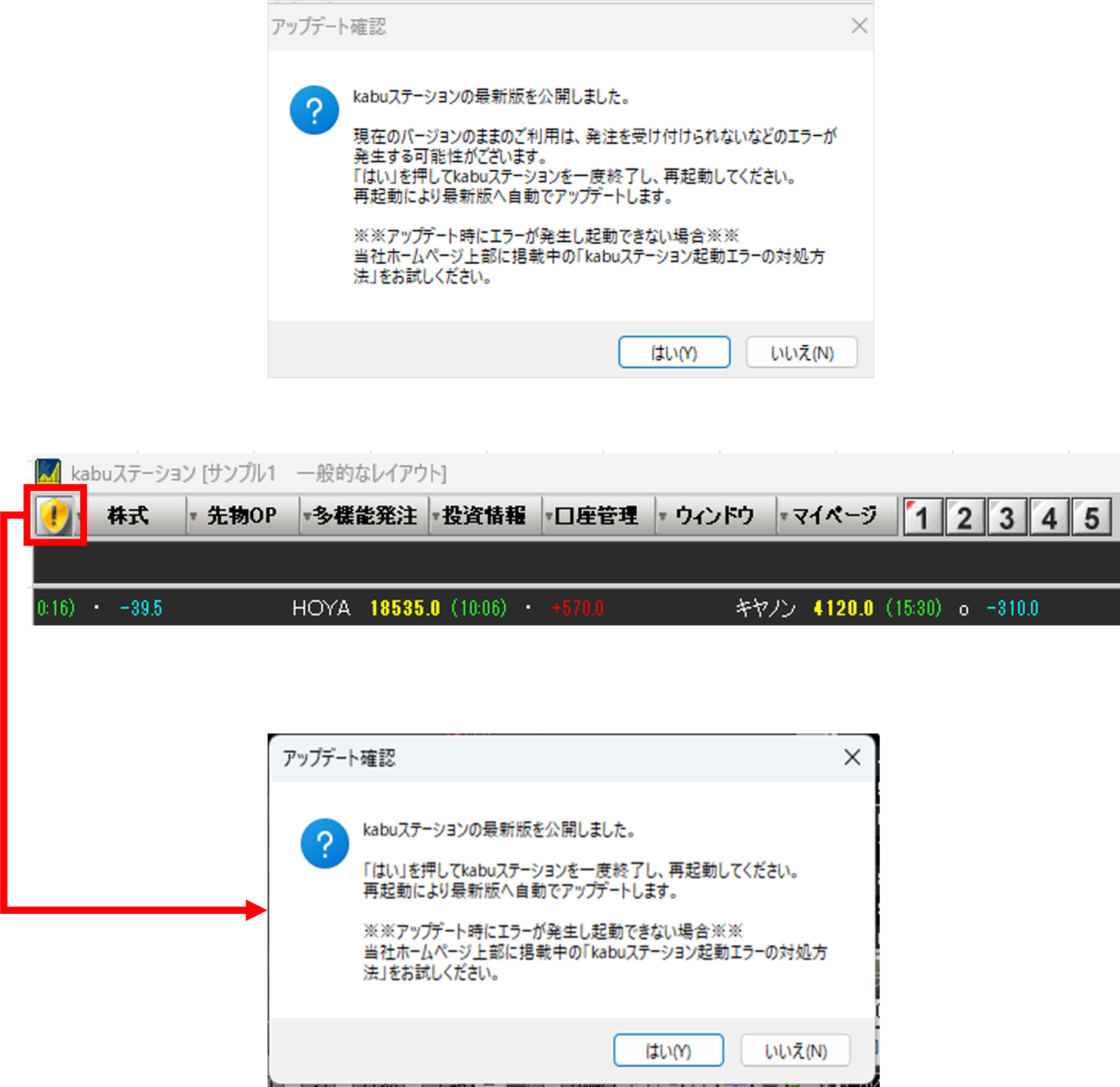 - ※Ver5.34.0.0以前のkabuステーション®では、7:00~8:50、21:00~24:00の間「アップデート確認」のポップアップが繰り返し出る場合がございます。また、メニューバー左側にも以下のアップデートに関するアイコンが表示された際、メッセージのとおりに再起動しても自動アップデートは行われません。