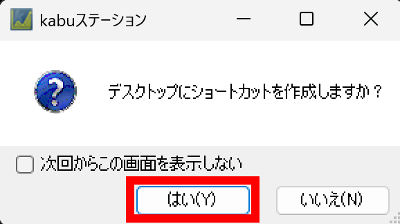 デスクトップへのショートカット作成メッセージが表示されますので、「はい」を選択してください。
