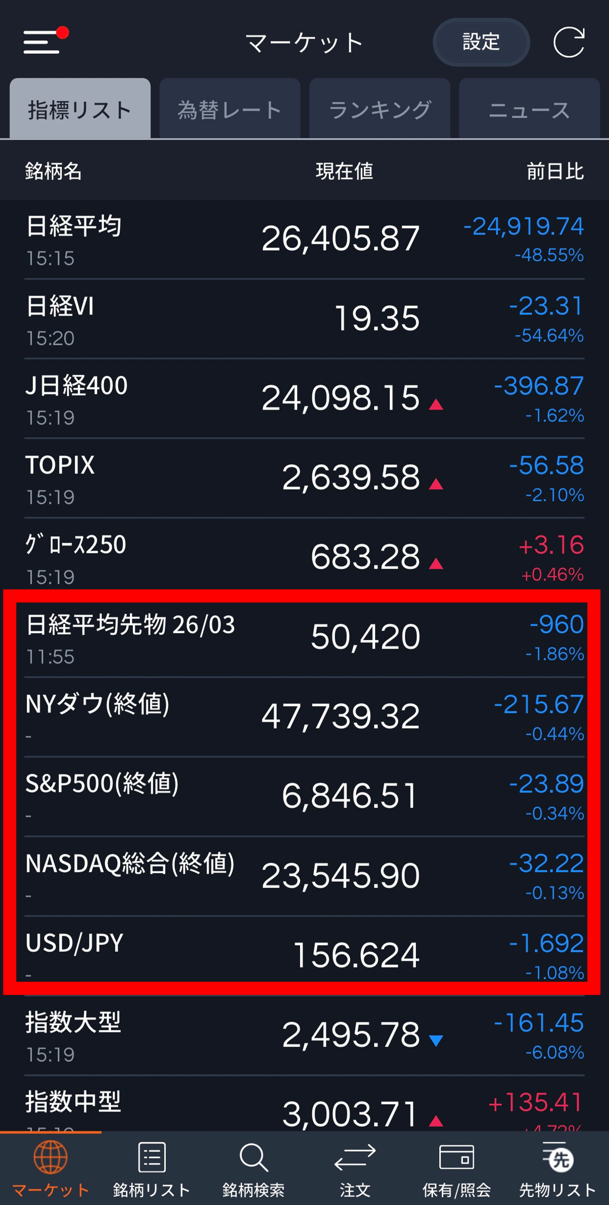 - ※米国株式の3指数は直近終値のみの表示となります。また3指数のチャート画面は今後のバージョンアップでの追加を予定しておりますため、タップをしてもチャート画面には切り替わりません。