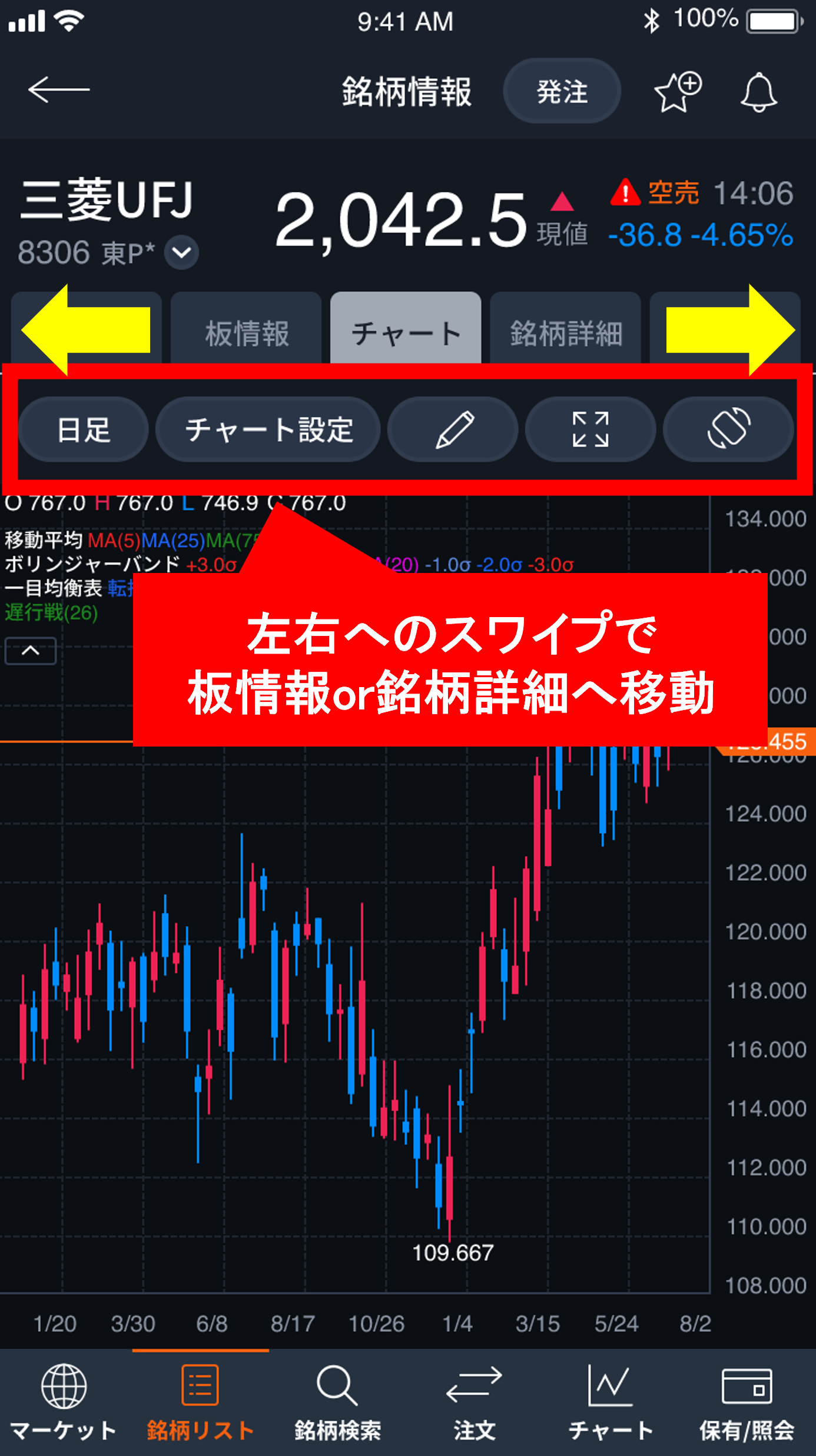 チャート画面の特定の範囲において、左右へのスワイプによるタブ移動(表示内容の切り替え)が可能となります。