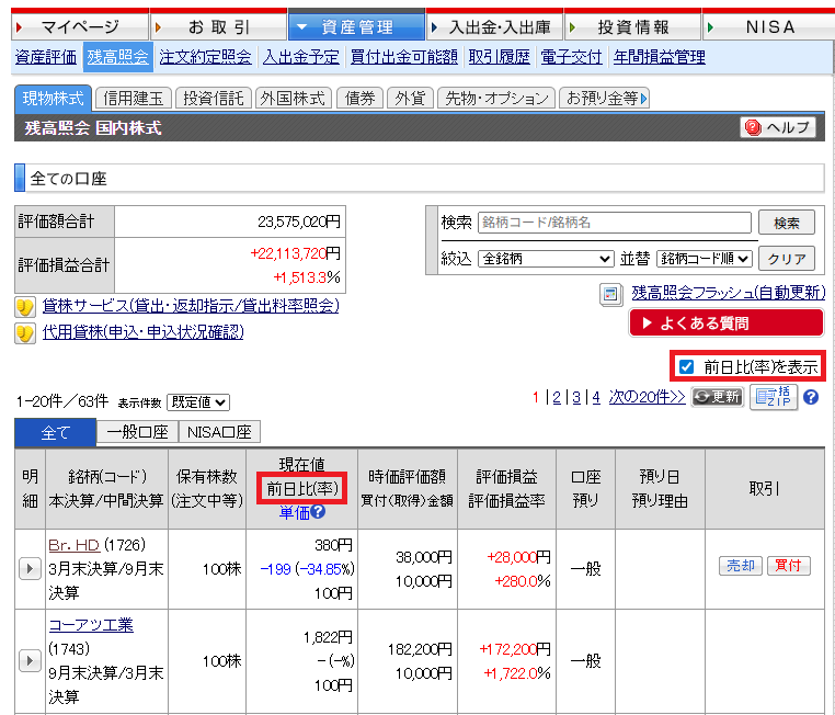 残高照会の「現物株式」「信用建玉」に、前日比(率)を追加いたしました。