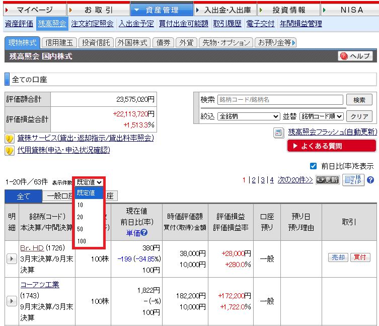 残高照会の「現物株式」「信用建玉」の表示件数に50件と100件を追加いたしました。