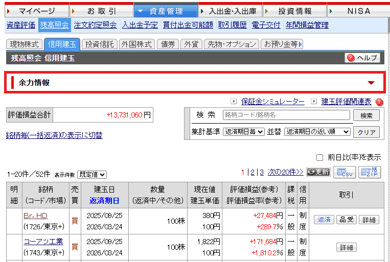 残高照会の「信用建玉」において、余力情報の表示/非表示状態を保持できるよう対応いたしました。