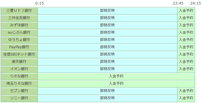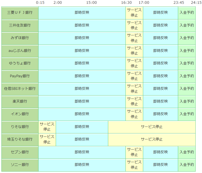 | 三菱UFJ銀行 三井住友銀行 みずほ銀行 | 営業日 | 即時反映 | 0:05~19:00 | 0:15~16:30 17:00~23:45 |