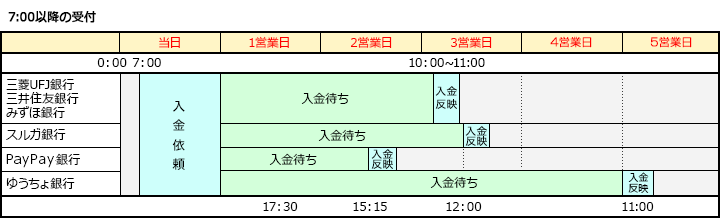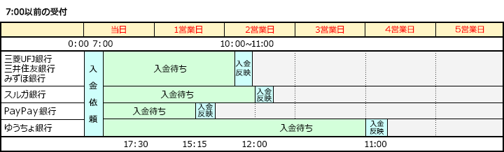 | ゆうちょ銀行 | 7:00以前の受付 | (4営業日後)17:30 | (4営業日後)11:00 |