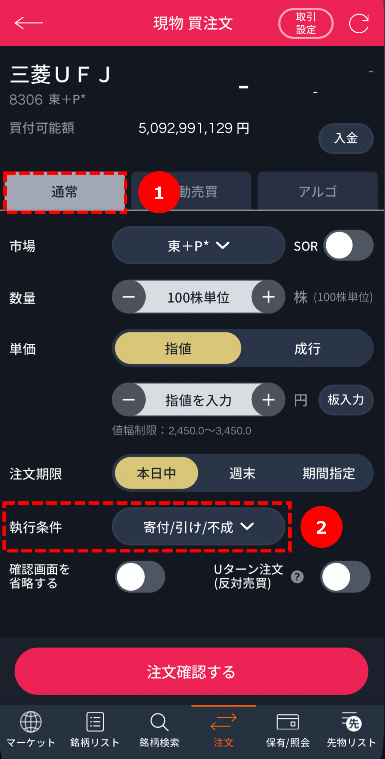 - 執行条件より「寄付」、「引け」、「不成」の指定が可能です。