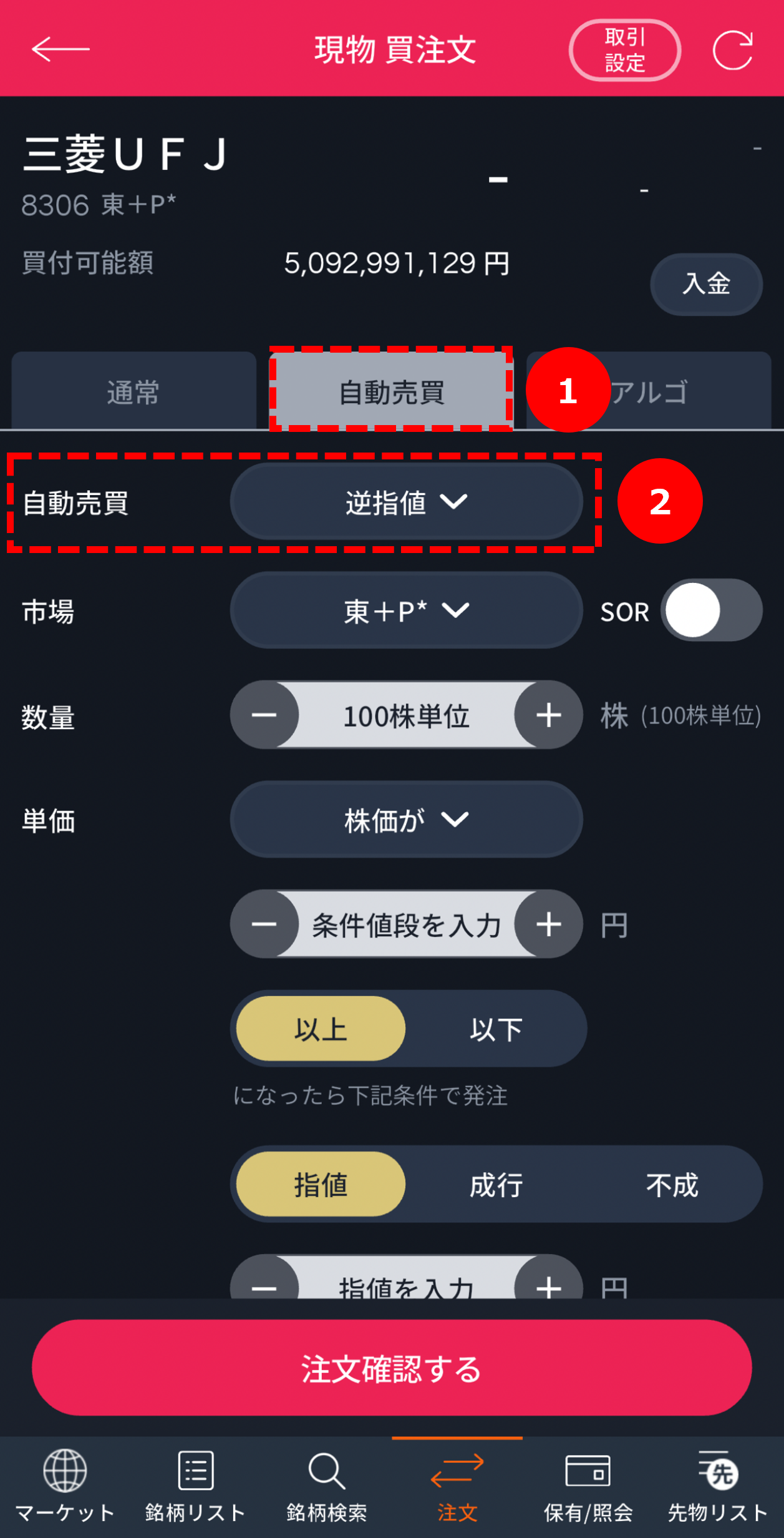 - 「逆指値」タブを「自動売買」タブに変更します。