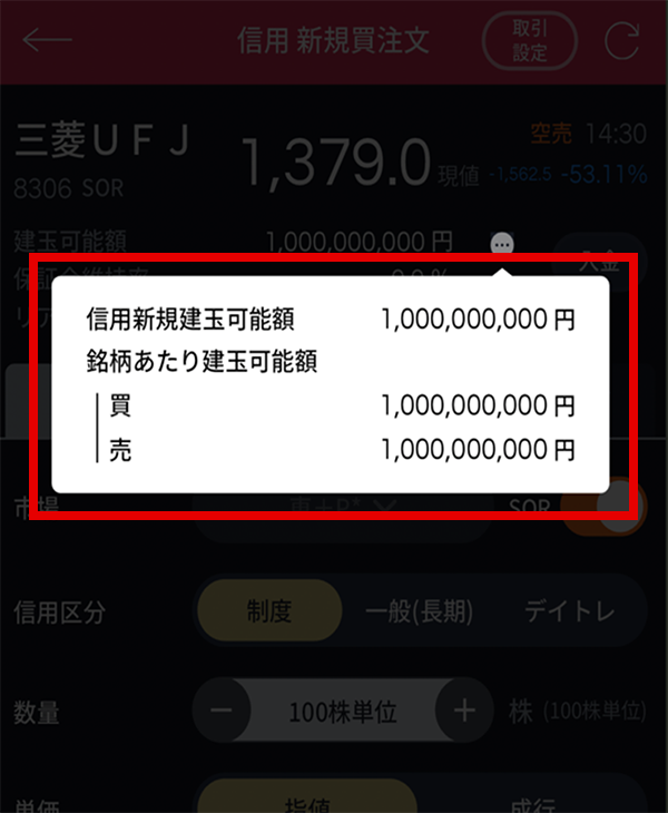信用新規建玉画面に、新たに「銘柄あたり建玉可能額」が追加されます。
