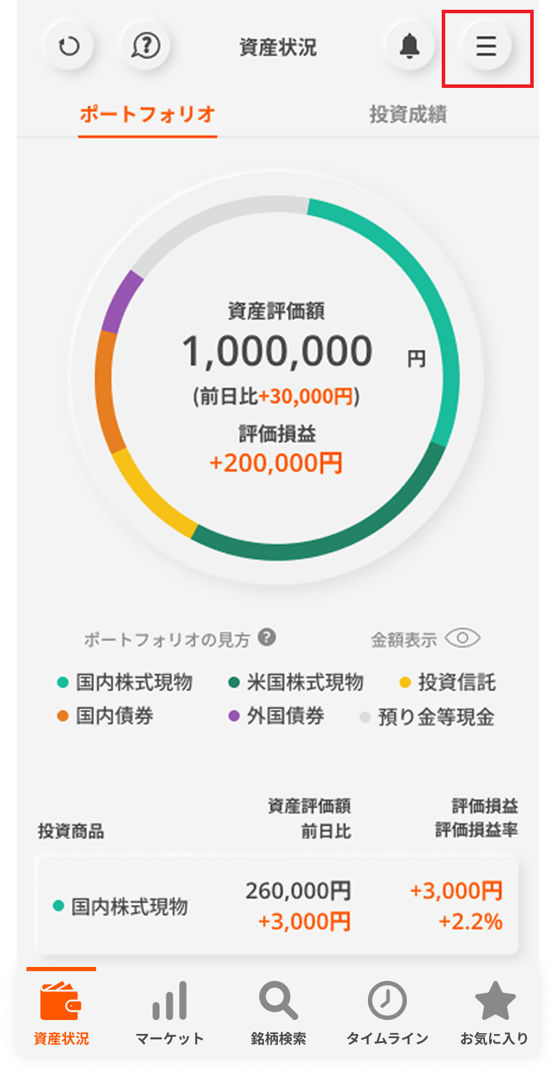 スマートフォンアプリにログイン後に表示される「資産状況」画面の右上「☰」をタップし、メニュー画面に遷移してください。