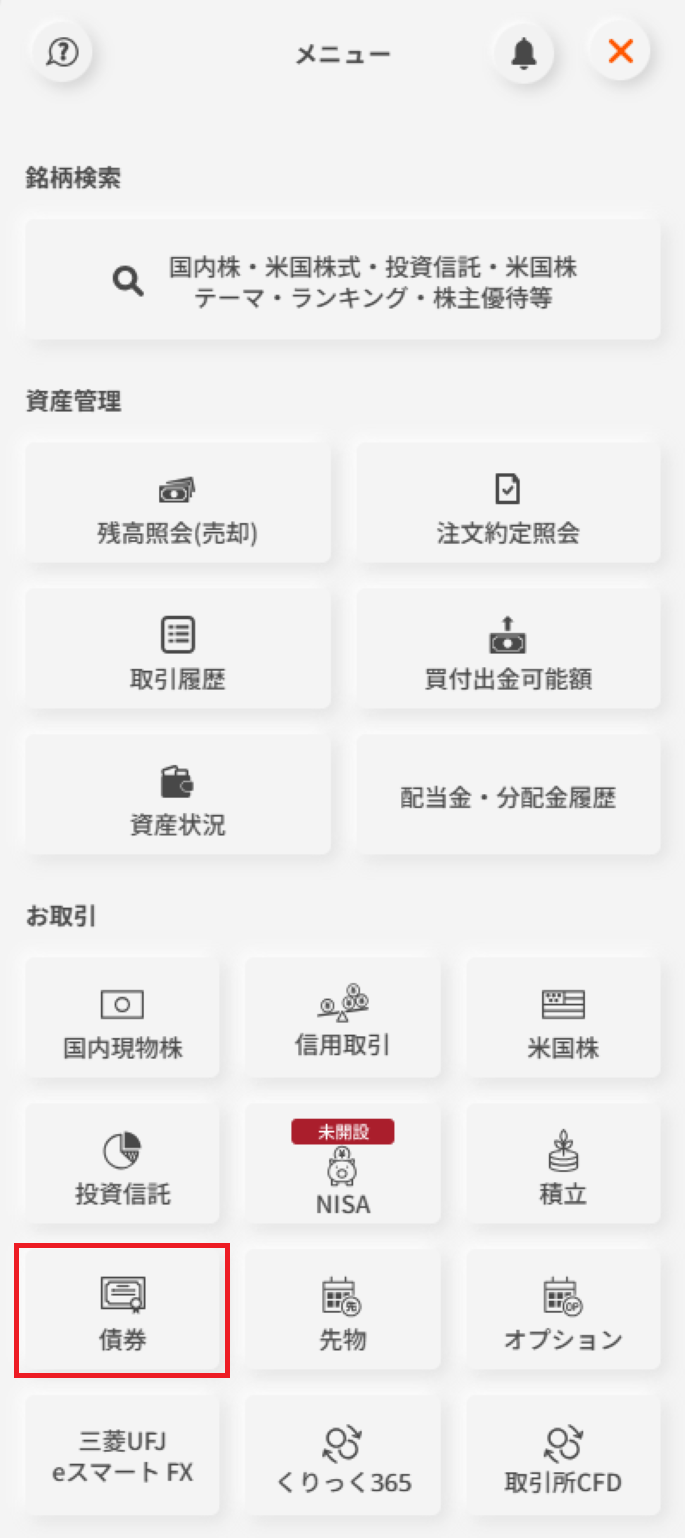 三菱UFJ eスマート証券のスマートフォンアプリのメニュー画面に「債券」を追加いたしました。