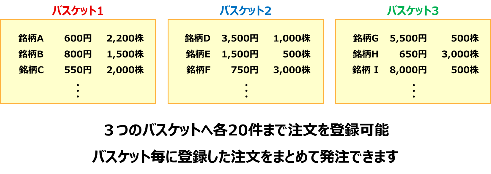 たとえば、日経平均株価が一定の値段以上になったら、それをシグナルとしてA株とB株とC株をまとめて成行で買いたいという投資戦略をもっている場合、バスケットに登録しておけば、実際にそのシグナルがあった際にボタン1つで発注できますのであわてることもありません。