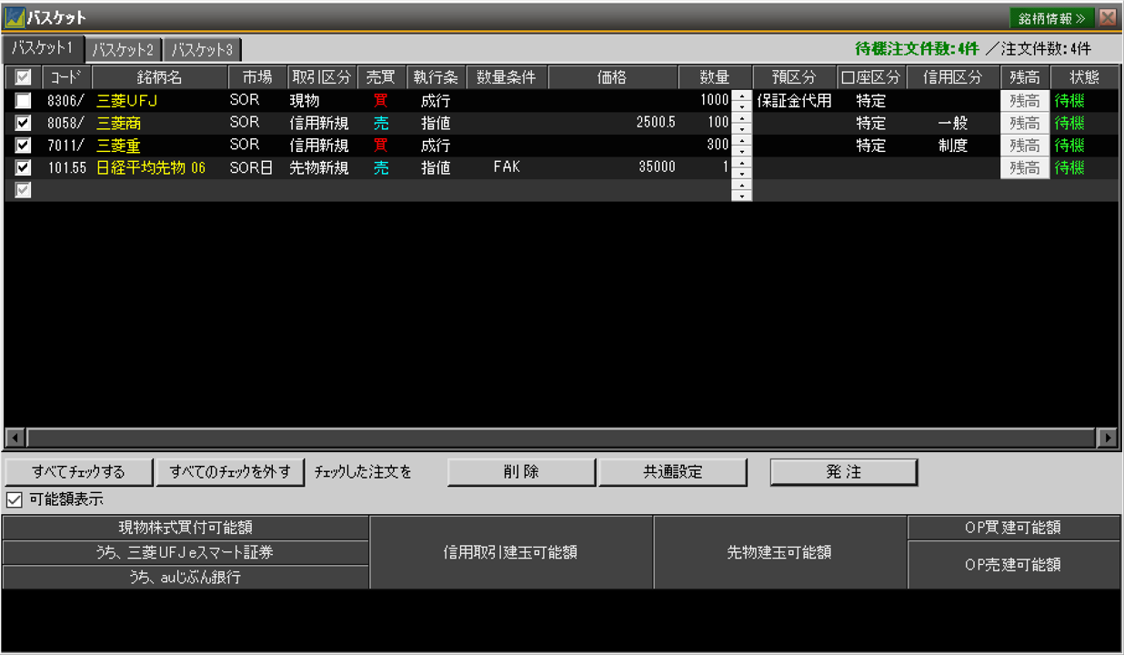 バスケット注文は、「現物」「信用」「先物」「オプション」の複数の注文を、1つのバスケットとして登録し、これらの注文を一括して発注することができます。