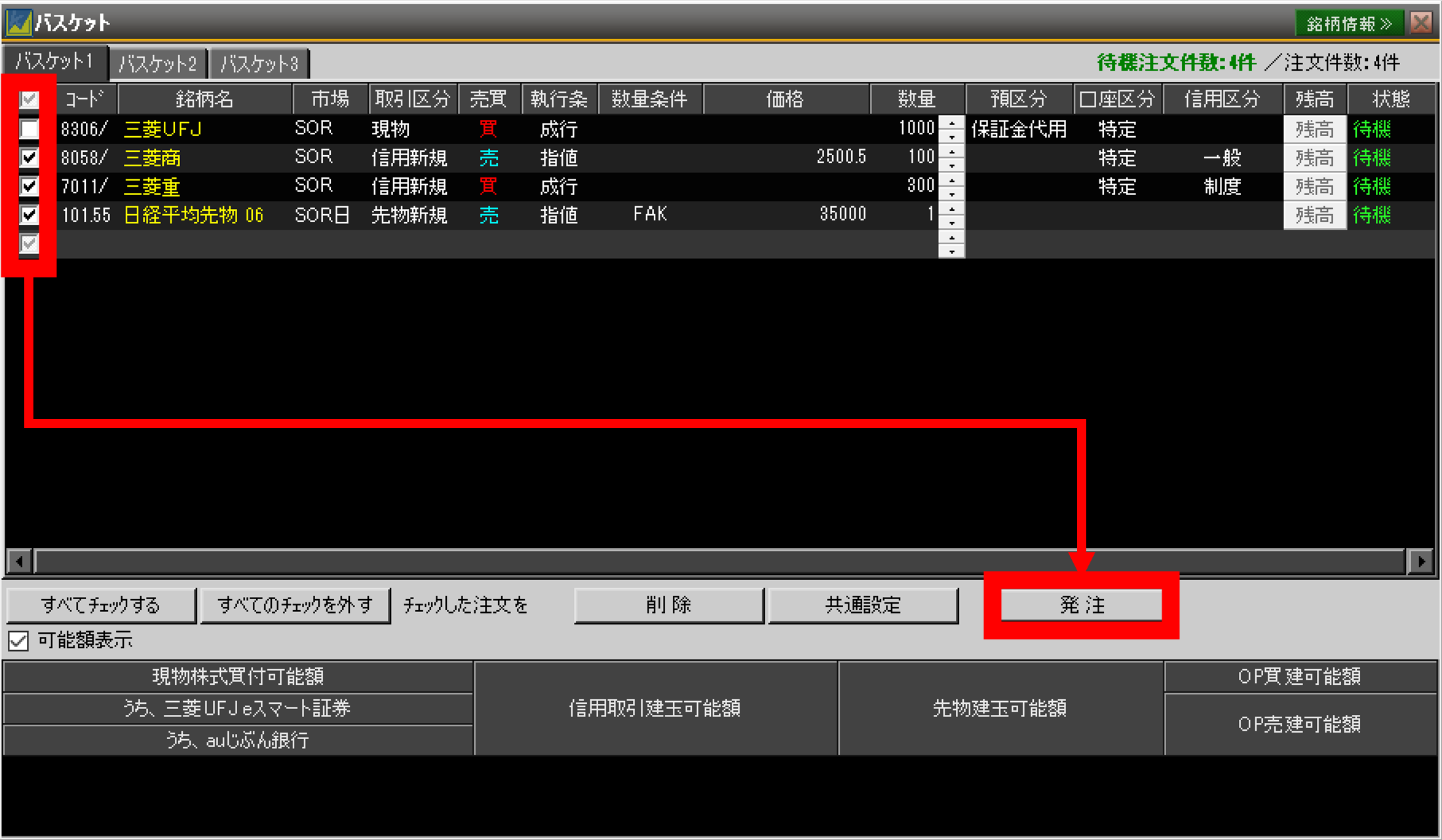 - ※バスケットを設定しても「買付可能額」「新規建玉可能額」は拘束されません。同じ現物株の売却や建玉の返済注文を、複数のバスケットに重複して登録することも可能です。