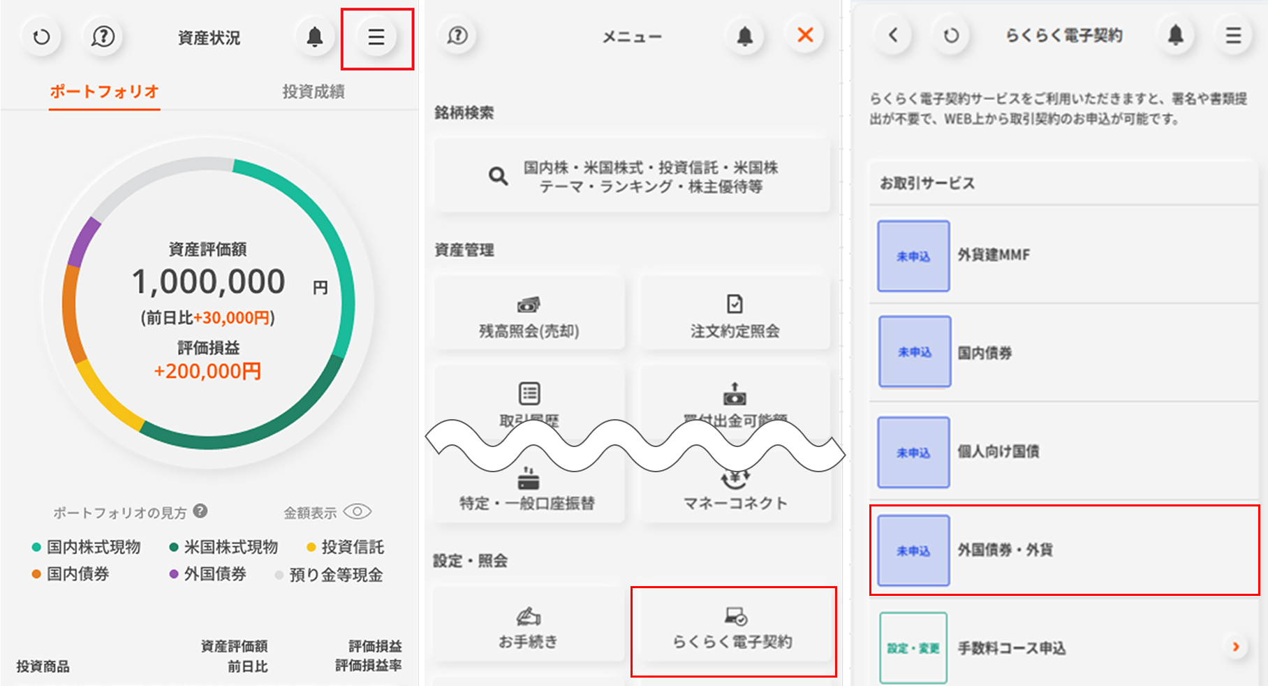 ログイン後ページ→「設定・申込」→「らくらく電子契約」→「外国債券・外貨」→「申込」