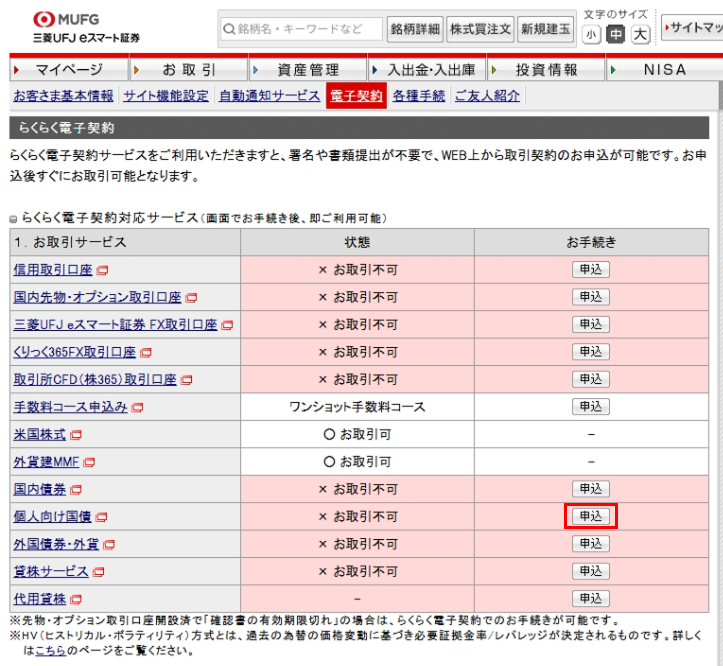 ログイン後ページ→「設定・申込」→「らくらく電子契約」→「個人向け国債」→「申込」