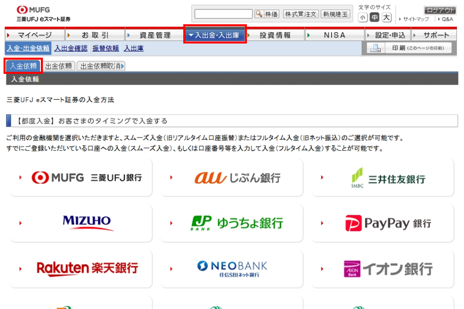 ログイン後、画面上部の「入出金・入出庫」をクリックすると、入金依頼画面が表示されます。当画面よりお客さま専用の振込口座を確認してください。