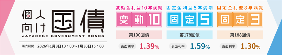 - 個人向け国債は、償還時や中途換金時に、発行体である日本国の信用状況等の悪化等により、投資元本を割り込み、損失が生じるおそれがあります。