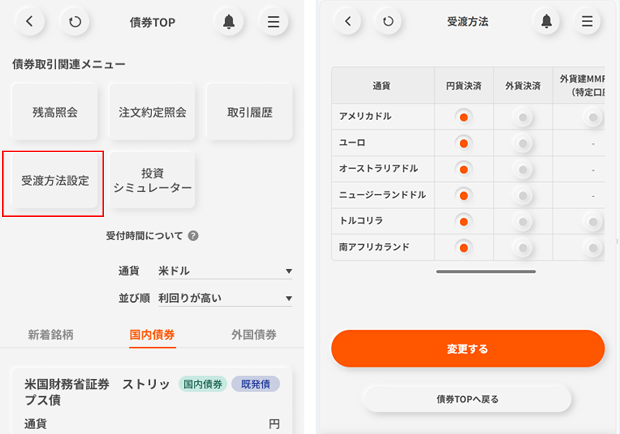 外国債券の利金・償還金の受渡方法は通貨ごとに設定ができます。