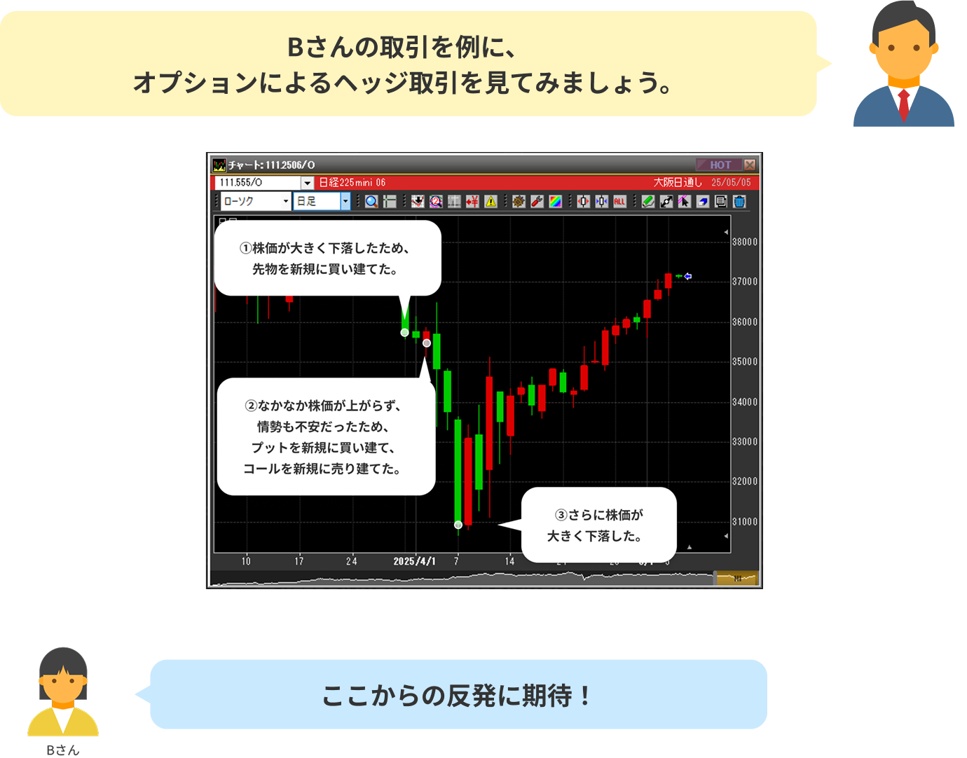 さらにプットオプションを買い建てることで、株価が大きく下落した場合でも利益を得られる可能性があります。海外の市況や要人発言など、過去に株価が大きく変動した事例を参考に、ヘッジプランを立てることが肝要です。