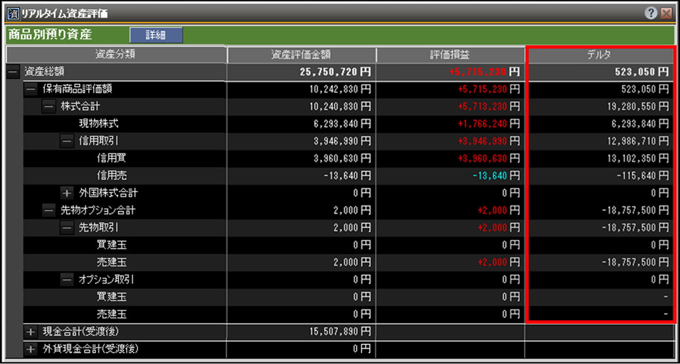 現物株式、信用取引、先物・オプションの評価損益やデルタを一元管理できます。
