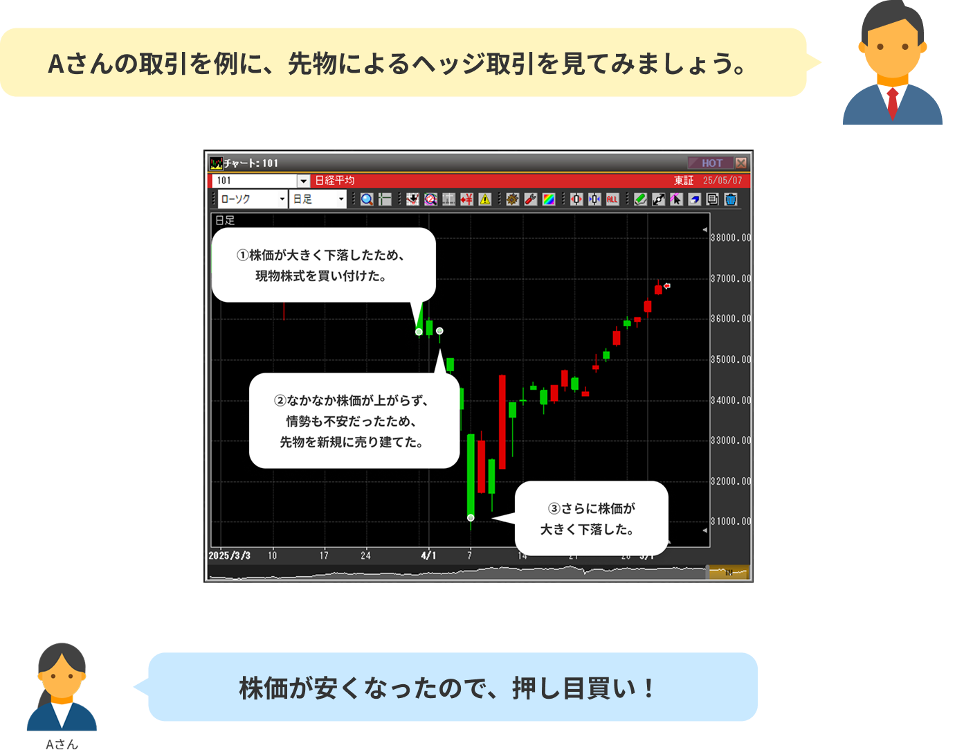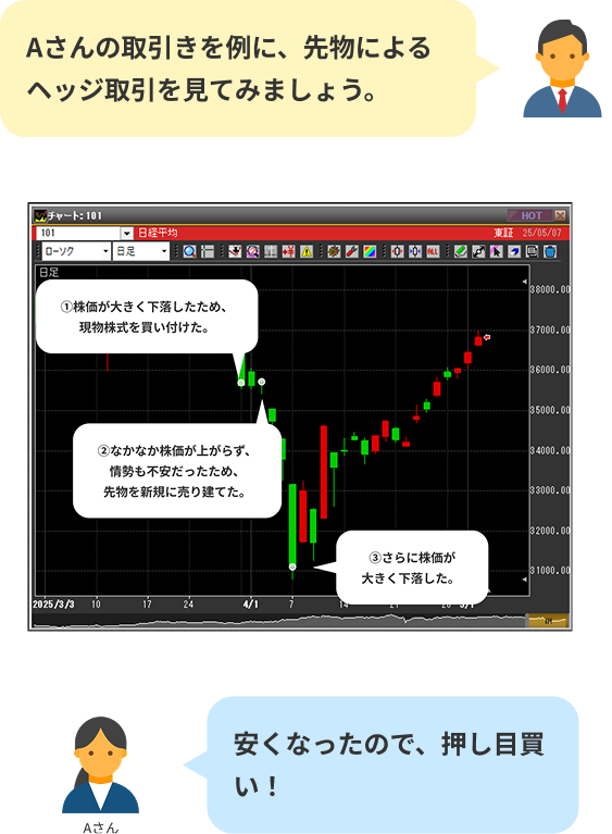ヘッジ取引とは、価格変動リスクを軽減するための戦略です。先物やオプションを活用することで、現物株式や信用取引、先物取引の買建玉の値下りによる損失を抑えることができます。