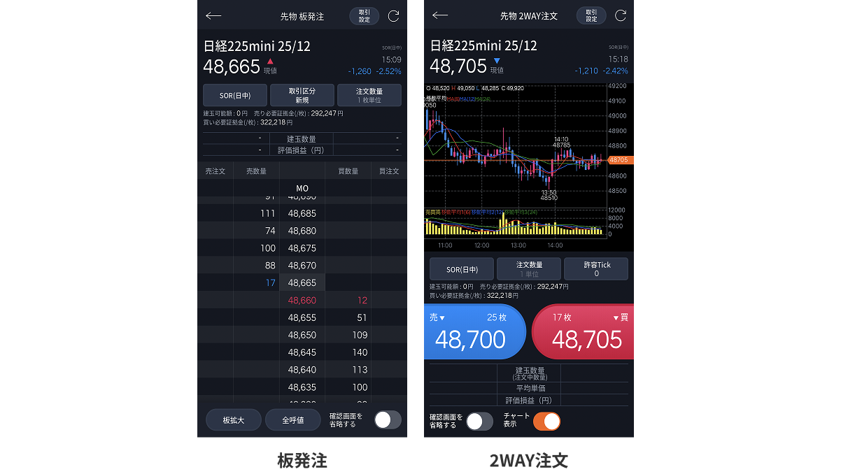 スマホアプリ「株・先物OPアプリ」でも、板発注や2WAY注文に対応しており、外出先でもスムーズな取引を実現。チャート機能では日中足や各種テクニカル分析が利用できます。