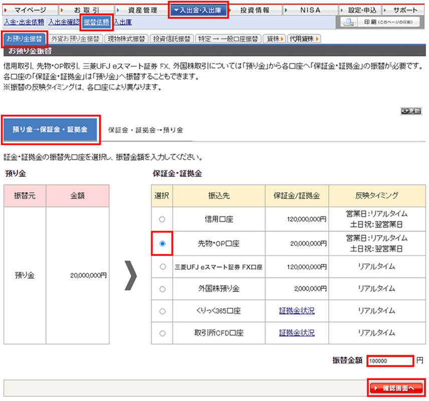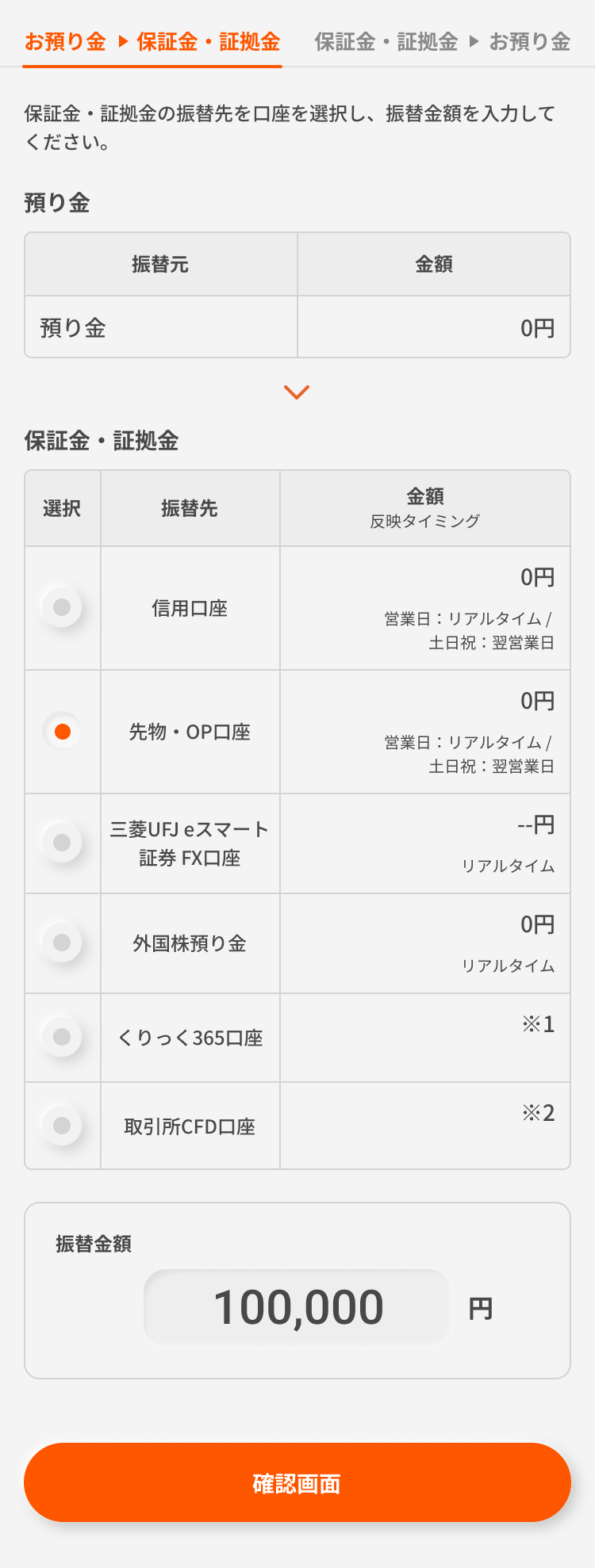 表示されたお預り金振替画面にて、「お預り金→保証金・証拠金」から、「先物・OP口座」を選択し、振替金額を入力のうえ、「確認画面」をタップ、表示画面に従って振替依頼をしたら完了です。