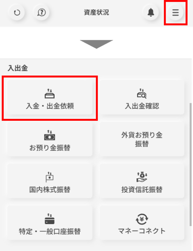 三菱UFJ eスマート証券 アプリにログインし、画面右上の(≡)アイコンをタップし、「入金・出金依頼」をタップします。