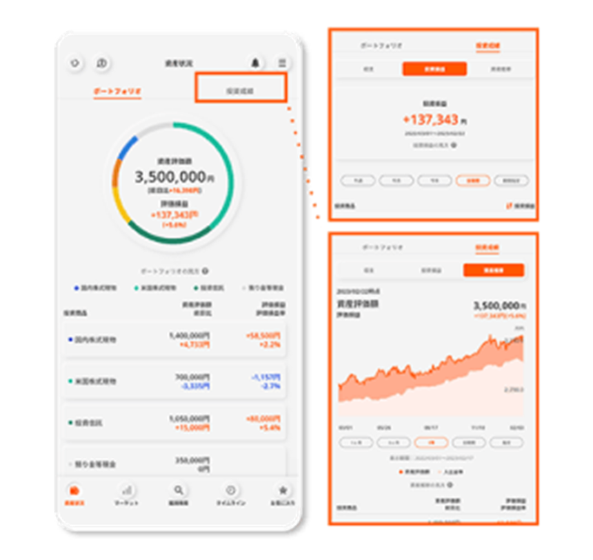 ポートフォリオ画面や投資成績画面で、金融商品ごとの資産評価額、収支、投資損益、資産推移を、シンプルなグラフにより直感的に確認することができます。