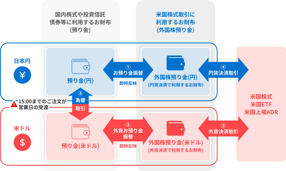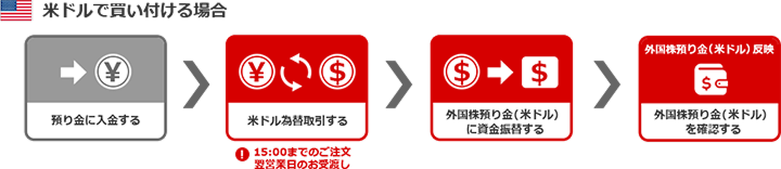 - 預り金(円)にお預りしている円貨から米ドル決済で米国株をお買付いただく場合、事前に外貨取引(為替取引)を行い、円貨を米ドルに交換し、外国株預り金(米ドル)へお客さま自身で振替えていただく必要があります。