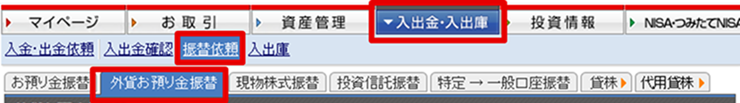 1.マイページの「入出金・入出庫」メニューより、「振替依頼」>「お預り金振替」を選択してください。