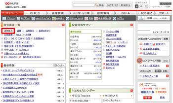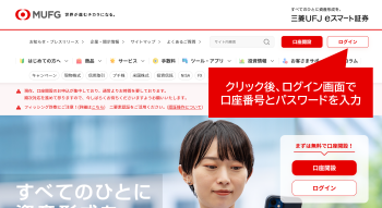 三菱UFJ eスマート証券のトップページよりログインします。口座開設が完了するとお客さま専用の取引ページが用意されます。