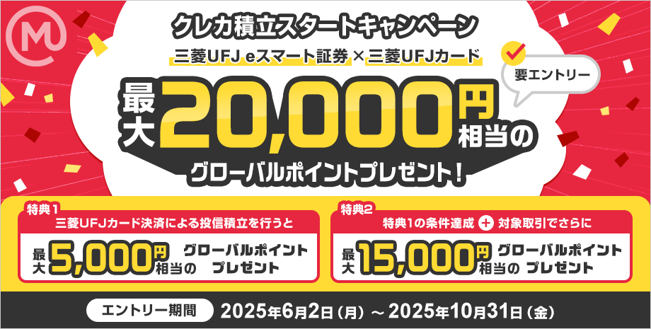 | 内容 | 毎月1回、1日(休業日の場合は翌営業日)を指定日として、三菱UFJカード決済による投資信託の積立を行うことができます。三菱UFJ eスマート証券口座に事前に入金していなくても、三菱UFJカードのご利用可能枠をつかって毎月自動で積立をすることが可能です。毎月積立で買付された投資信託の約定金額に応じてグローバルポイントを還元します。 |
