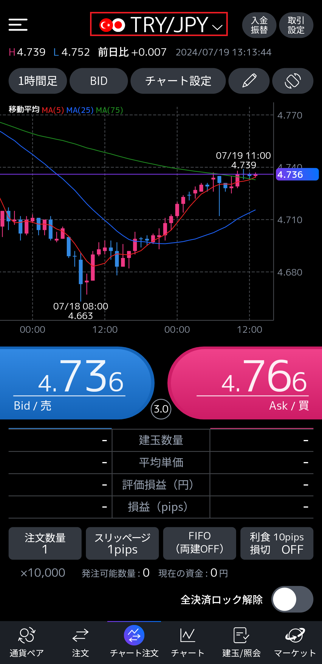 通貨ペア「TRY/JPY」を選択し、買い注文を出す。