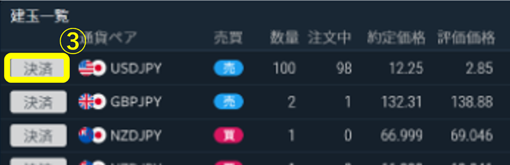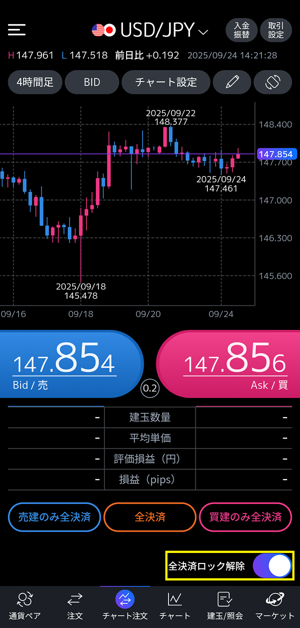 全決済ロック解除を「OFF」から「ON」に切り替えると、全決済ボタンがタップできるようになります。全決済ボタンで選択の通貨ペアの保有建玉をすべて決済することができます。
