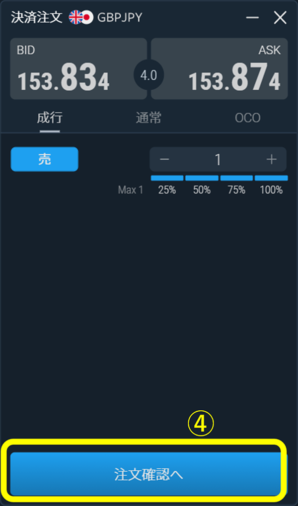 ④ 売り注文の場合は青いプライスボタン「売」、買い注文の場合は赤いプライスボタン「買」をタップして注文します。