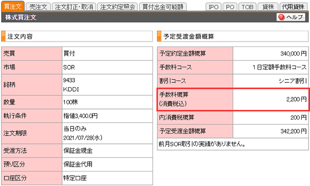 ご注文時はいったん基本手数料による概算金額が表示されますが、割引サービスにより再計算された手数料は、約定日の18時頃に取引履歴画面等でご確認いただけます。